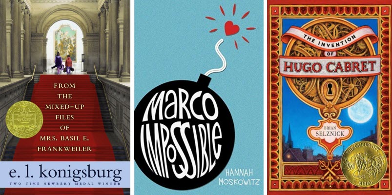 From the Mixed-Up Files of Mrs. Basil L. Frankweiler is a classic. Sure that she’s unappreciated at home, Claudia makes a carefully detailed plan to run away from home, with her younger brother Jamie for company. They take the train to New York City and “move in” to the Metropolitan Museum of Art. In Marco Impossible, Stephen and Marco are best friends and fellow detectives, solving (admittedly silly) cases which they write up in their casebook. As middle school draws to an end, Marco plots one final scheme before they’re all off to different high schools. Addresses homophobia, hate crimes, cyber bullying, physical attacks, and the fear that comes with coming out … and falling out with your best friend. And in The Invention of Hugo Cabret, Hugo has always had a knack for clockworks, so after his inventor father passes away and his timekeeper uncle disappears, Hugo maintains the many clocks at the train station. Quietly. Alone. But petty theft gets him into serious trouble. Lavishly illustrated!
