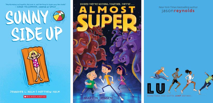 Sunny Side Up is a graphic novel. Sunny goes to stay with her grandfather in a Florida retirement community. The reasons for this visit unfold through a series of flashbacks about her older brother, who’s fallen in with a bad crowd. (Rule-breaking, drinking, drug use, violence, etc.) So Sunny’s mostly stuck with a bunch of old people and their weird habits. In Almost Super, Rafter and his brother Benny are Baileys, and they’re about to come into the family legacy. On Leap Day, every Bailey who’s turned twelve inherits their super power. Which they use in their ongoing battle against the Johnsons (insert fist-shake). But their big moment doesn’t arrive in quite the way it should. Rafter and Benny are determined to get their due, even if it means taking on the Johnsons (insert fist-shake) alone. The Track series wraps up with Lu‘s story. Albinism and armor. Mistakes and making up. Hurdles and hard truths. Lessons learned and lightning striking twice. Amazing series. I loved these kids, their families, their coach, and their courage.