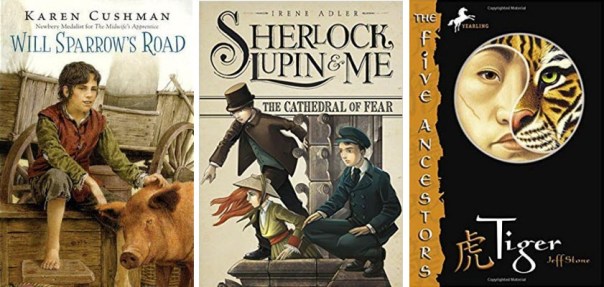 In Will Sparrow’s Road, Will is a liar, a thief, and a runaway who only looks out for himself. But he’s beginning to understand that you can’t trust what a person promises any more than you should put stock in how a person looks. Oddities and rarities and misfits. Good and bad and belonging. The Cathedral of Fear is the fourth book in the series. A mystery that mostly takes place in war-torn Paris … and is riddled with references to streets and sites that would warm any historian’s heart. Interesting references to the famed French author Alexandre Dumas. More adventure than mystery here, since readers aren’t given many clues or enough context to solve the problem. And (alas!) English-speaking readers are left hanging by the final revelation, which hints at more, because these first four books are the only ones that have been translated from the original Italian. And Tiger kicks off a kung fu series. Five young kung fu masters are hidden away by their teacher when their temple is overrun and its one hundred fighting monks slaughtered. They must stop the one who planned this massacre, someone who they considered a brother, one of their Grandmaster’s former pupils. This book takes place from the point of view of Fu, whose name means tiger and who uses tiger-style fighting.