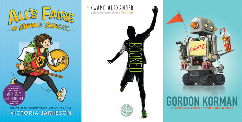 All’s Faire in Middle School is a graphic novel. Imogene, who goes by Impy, has always been homeschooled, but this year, she’ll be attending the local middle school. Fitting in proves to be a challenge, in part because Impy’s family work at the Ren Faire. So while she can juggle and sword fight and insult passersby with Elizabethan flourish, Squire Impy doesn’t understand the rules of middle school, where cliques rule the day instead of queens. Being the new kid is harder than slaying dragons. Booked is a novel in verse about a boy who loves soccer, hates reading the dictionary, and hopes to impress the prettiest girl in his class. All while navigating his parents’ separation. Ungifted is a lot of fun! Thanks to a chance mix-up, Donovan (wreaker of havoc & troublemaker extraordinaire) finds himself transferred into an elite school for super geniuses. It’s a nice place, so he floats along, partly because he doesn’t want the superintendent to find him (due to past havoc & attendant trouble), partly because he kind of likes the kids in his class.