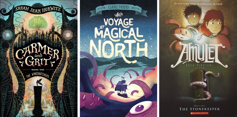 The Wingsnatchers is the first in an exciting new series that mingles sleight of hand with the magic of the seelie courts. Carmer is a magician’s apprentice (the sleight of hand variety) and a dabbler in invention, so he has trouble believing his eyes when he meets a one-winged fairy named Grit. In The Voyage to Magical North, two orphans run away from their employer, only to be captured by pirates. Fanciful world-building and little comedic twists. An ensemble cast who are vividly themselves. And just enough temptation and peril to keep the voyage zinging long nicely. And I finally got around to reading the much-acclaimed Amulet series of graphic novels. When Emily’s family moves to the middle of nowhere, to live in a house that’s been in the family for years, she discovers a strange amulet, which triggers a startling series of events. Monsters in the basement. The entrance to another world. A confusing legacy. A dangerous rescue.