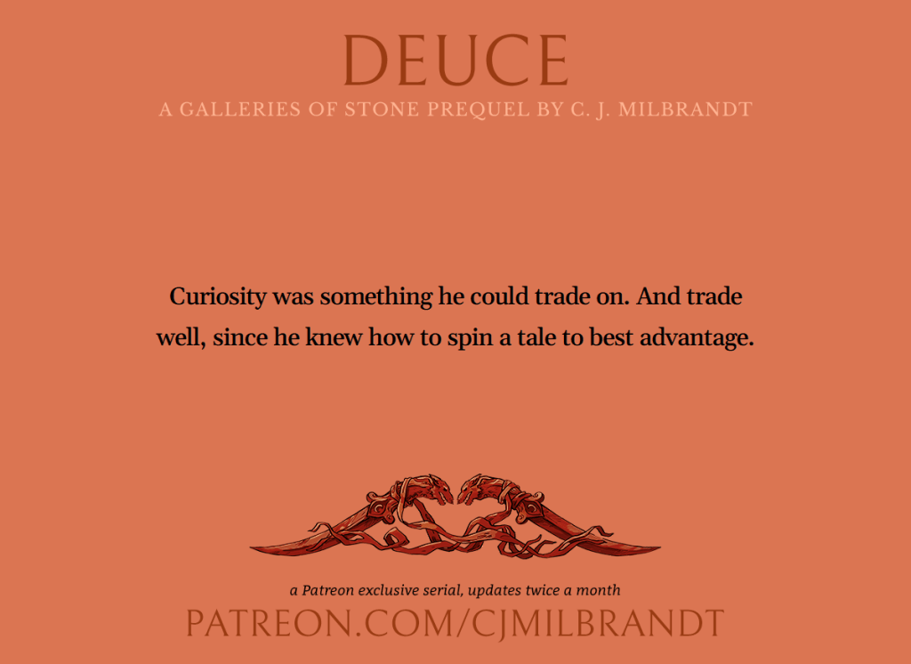 Audio Update! My Patreon have just seen an audio update to Deuce, a Galleries of Stone prequel. Interested? You can read along if you join at the lowest tier ($5/month). Audio chapters drop every other Wednesday and can be accessed if you’re at the Journeyman tier (or up). Eventually, the book will publish to print/digital/audio … but patrons get to see the story unfold as I write it! CJ on Patreon >>